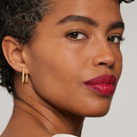 The Bold & Sophisticated bridal makeup look features defined brows, long lashes and a bold cool red lip.