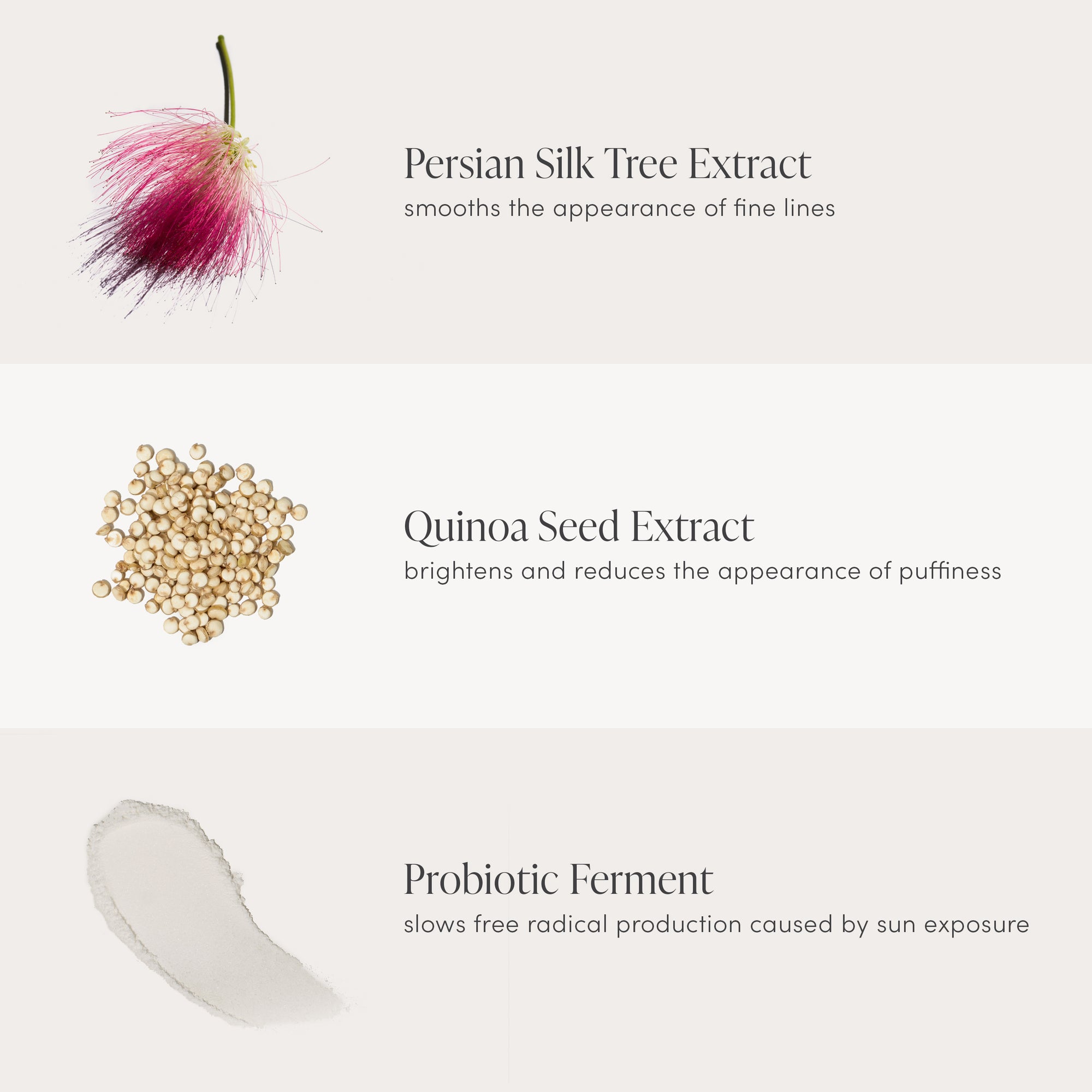 • Quinoa Seed Extract brightens and visibly reduces the appearance of puffiness.